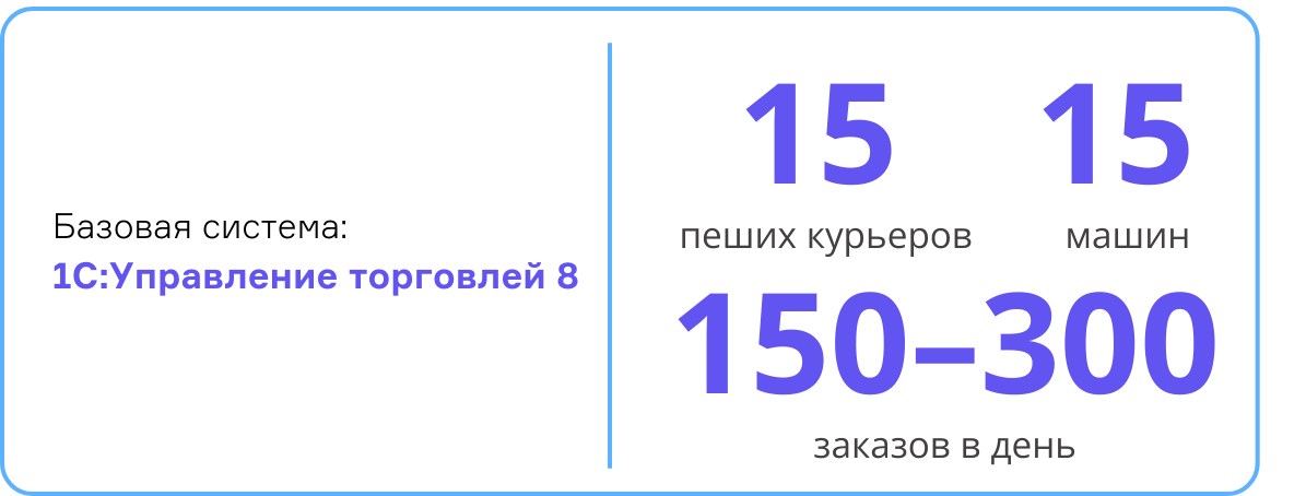 150−300 заказов, которые развозит с помощью пеших курьеров и водителей.